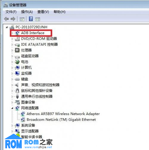 如上圖所示手機進入刷Recovery模式後,用數據線將手機和電腦鏈接。此時電腦會提示發現新硬件並安裝硬件(此過程大概兩分鐘)。如果第一部分的驅動程序安裝沒問題的話,硬件識別安裝完成後在你的電腦中的設備管理器中應該看到一個ADB inte**ce的設備。如果看到這個設備說明你的手機已經和電腦正確的鏈接並能刷Recovery了!