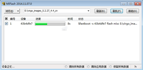 9:一直退回到刷機界面,然後點擊“刷機”按鈕,就開始給手機線刷了,一般情況下前幾秒的時候進度條就已經走了將近一半了,如果沒走的話,可能是會失敗。線刷時間根據每人電腦不同又長又短,一般不超過200s,過一會界面顯示“操作成功完成”,就表示線刷成功,手機會自動重啟。