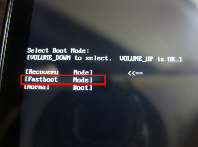 3:接下來手機要進入FastBoot模式,進入的方法:手機關機狀態下,按住“電源鍵”+“音量下鍵”出現一個界面,在此狀態下按“音量下鍵”選擇 Fastboot Mode 然後再按“音量上鍵”或電源鍵來確認即可進入線刷模式: