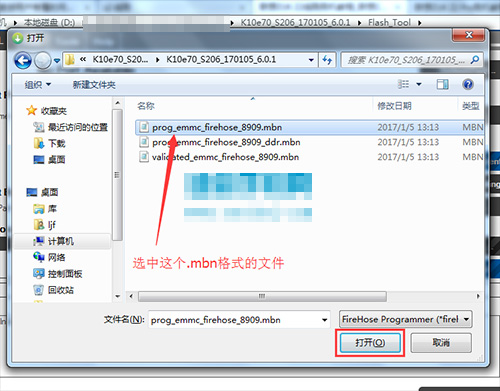 4:點擊“Browse…”,在彈出的對話框中選擇:prog_emmc_firehose_8909.mbn 文件並打開。