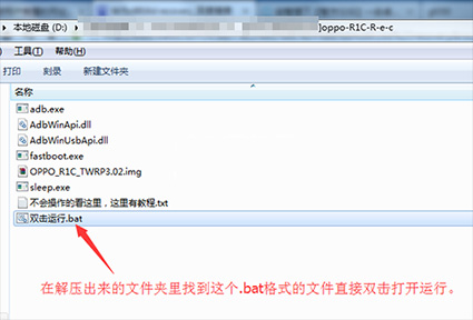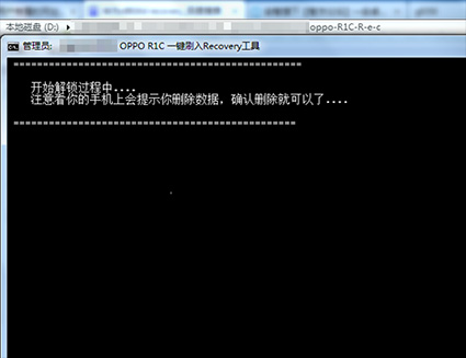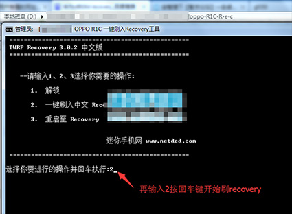 3:然後把上面下載下來的recovery工具包在電腦上進行解壓,解壓出來一個文件夾,然後在文件夾裡找到【雙擊運行.bat】文件,直接雙擊打開運行,然後根據提示輸入1接著按回車鍵先進行解鎖,【注意:手機上會提示你刪除數據,確認刪除就可以了】,解鎖成功之後,再輸入2並按回車鍵開始刷入recovery了。