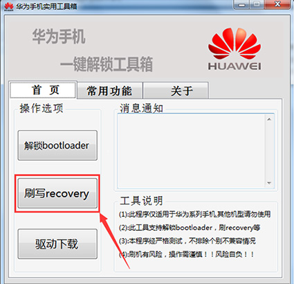 3:然後把上面下載下來的recovery工具包在電腦上進行解壓,解壓出來一個文件夾,然後在文件夾裡找到【華為工具箱.exe】文件直接雙擊打開運行,(一些殺毒軟件可能會提示這個軟件危險,可以忽視不管,確認允許即可)然後點擊【刷寫Recovery】的按鈕並選擇剛才解壓出來的img格式的recovery文件,點擊確定之後軟件就會自動給手機刷入Recovery了。