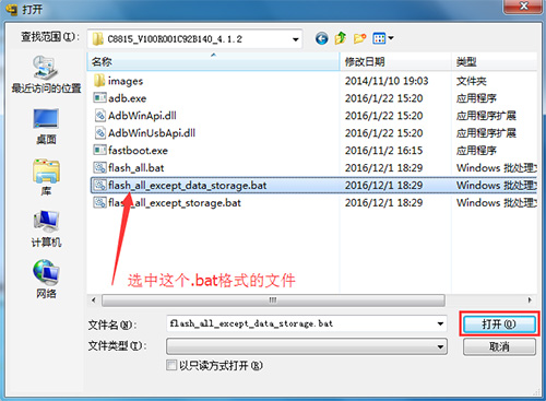 6:然後點擊浏覽按鈕旁邊的小箭頭,選擇高級設置,找到你剛才解壓出來的線刷包的rom文件夾裡的【flash_all_except_data_storage.bat】文件,然後點擊確定。