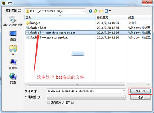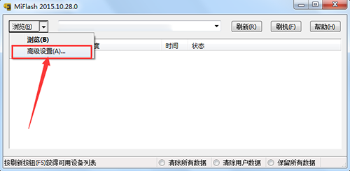 6:然後點擊浏覽按鈕旁邊的小箭頭,選擇高級設置,找到你剛才解壓出來的線刷包的rom文件夾裡的【flash_all_except_data_storage.bat】文件,然後點擊確定。
