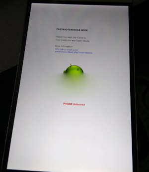 3:接下來手機要進入FastBoot模式,進入的方法:在手機關機狀態下,按住音量減少和電源鍵,當屏幕中出現一只安卓機器人則已經進入FastBoot模式,如下圖所示: