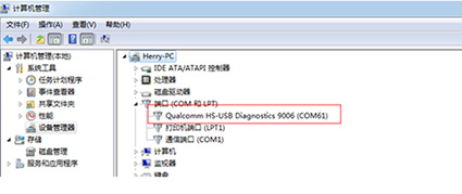 3:接下來手機要進入線刷模式,進入的方法:在手機關機狀態下,按住手機的音量上鍵 + 音量下鍵 + 電源鍵 + 同時插入數據線(或者同時按住手機的音量上下鍵的同時插入數據線)即可進入線刷模式,出現類似下面圖中的端口說明進入高通線刷模式,而手機進入的是黑屏模式。