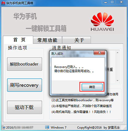 3:然後把上面下載下來的recovery工具包在電腦上進行解壓,解壓出來一個文件夾,然後在文件夾裡找到【華為工具箱.exe】文件直接雙擊打開運行,(一些殺毒軟件可能會提示這個軟件危險,可以忽視不管,確認允許即可)然後點擊【刷寫Recovery】的按鈕並選擇剛才解壓出來的img格式的recovery文件,點擊確定之後軟件就會自動給手機刷入Recovery了。