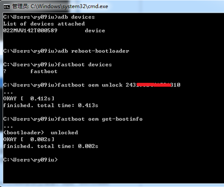5:再輸入fastboot oem unlock****************,*號為16位解鎖密碼,例如:fastboot oem unlock1234567812345678,回車確認,將會看到如下輸出,手機將發生重啟,重新進入fastboot模式,不出意外,已經解鎖成功。