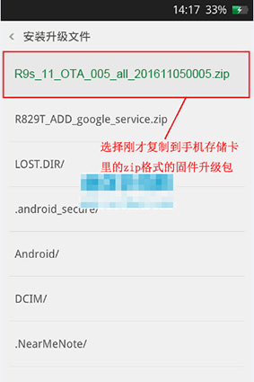 6:接下來選擇剛才復制到手機存儲卡根目錄下的zip格式的升級包,然後選擇確定,接著就開始安裝啦。