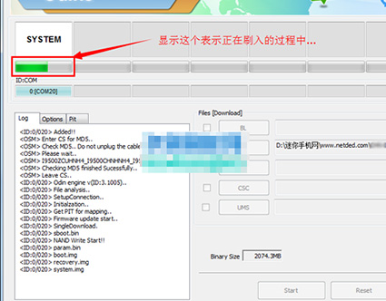 4:打開odin軟件之後軟件會自動識別你的手機,識別成功後會在ID:COM處顯示藍色的(表示手機連接成功了,如果沒有顯示藍色的,說明沒有有連接好),然後勾選AP,選取之前下載並解壓出來的tar格式的recovery文件包。