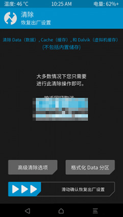 3:刷入ROM之前建議清空用戶數據,即清空data分區下的文件(所以,請實先務必做好重要數據備份工作,比如聯系人、短信、已安裝軟件等,內置存儲中的文件將不會被清除),相當於恢復出廠設置,操作方法是:點擊 “清除”,滑動下方的按鈕 “滑動按鈕開始執行”,很快就完成了該操作,一直點右下角返回箭頭,即可返回 Recovery 主界面。