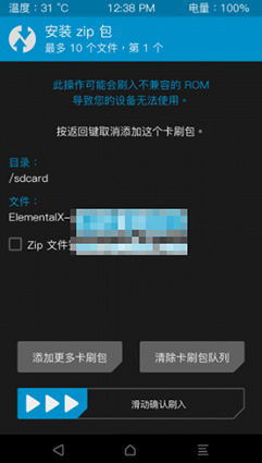 4:清理完成之後返回到recovery主界面,點擊 “安裝”,即可進入系統目錄選擇文件。選擇“選擇存儲器”可以切換內外存儲器,找到剛剛准備好的zip格式rom包,點擊它,然後滑動下方按鈕“滑動確認刷入。