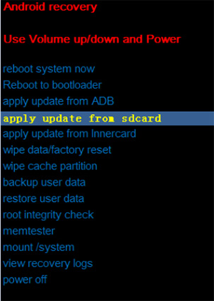 4:然後按音量上下鍵移動,選擇 apply update from external sdcard ,按電源鍵確認。