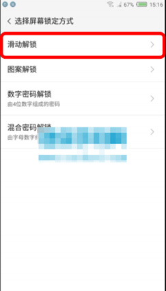 3:取消手機當前設置的“圖案解鎖”、 “數字密碼解鎖” 、“混合密碼解鎖”等屏幕鎖。更改為手機出廠默認的“滑動解鎖”方式。如下圖:進入 設置安全與隱私屏幕鎖定,選擇“滑動解鎖”。