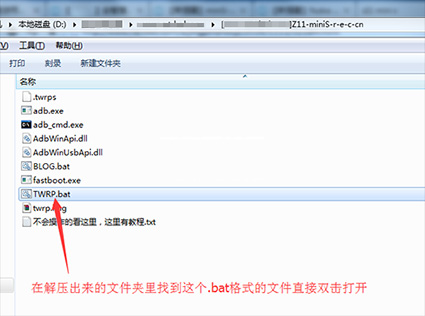 3:然後把上面下載下來的recovery工具包在電腦上進行解壓,解壓出來一個文件夾,然後在文件夾裡找到【TWRP.bat】文件直接雙擊打開,軟件識別出手機之後直接按回車鍵即可刷入。