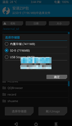 3:點擊 “安裝”,即可進入系統目錄選擇文件。選擇“選擇存儲器”可以切換內外存儲器,找到剛剛准備好的zip格式的root包,點擊它,然後滑動下方按鈕“滑動確認刷入。