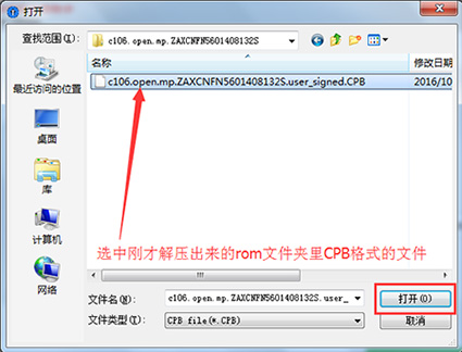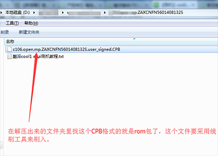 1:先把上面下載下來的固件rom包在電腦上進行解壓,如下圖,在解壓出來的文件夾裡看到裡面有一個.CPB格式的文件,這個就是線刷格式的固件包。