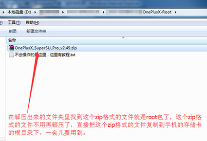 1:手機用usb數據線連接上電腦之後,把上面下載下來的rar格式的root包在電腦上進行解壓,解壓出來一個文件夾,然後在解壓出來的文件裡的找到【OnePlusX_SuperSU_Pro_v2.49.zip】包復制到手機的sd卡的根目錄下方便找到。