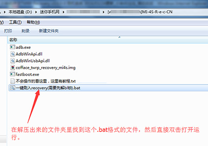 3:然後把上面下載下來的recovery工具包在電腦上進行解壓,解壓出來一個文件夾,在解壓出來的文件夾裡找到【一鍵刷入recovery(需要先解bl鎖).bat】文件,直接雙擊打開運行。