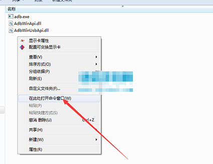 2:把上面下載好的adb工具包在電腦上進行解壓,解壓出來一個文件夾,進入文件夾裡,在空白處按住Shift鍵的同時點擊按鼠標右鍵,選在此處打開命令窗口。