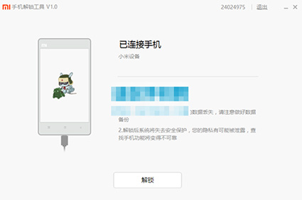 5:接著讓你的小米4S完全關機後,同時手機在關機的狀態下長按手機的“音量減少鍵 + 電源鍵”,兩鍵同時按住不要松,進入紅米3的Fastboot模式(有個兔子的界面就是了),(手機系統必須為MIUI開發版,穩定版無法解鎖),然後數據線插入手機和電腦聯機,點擊“解鎖”。
