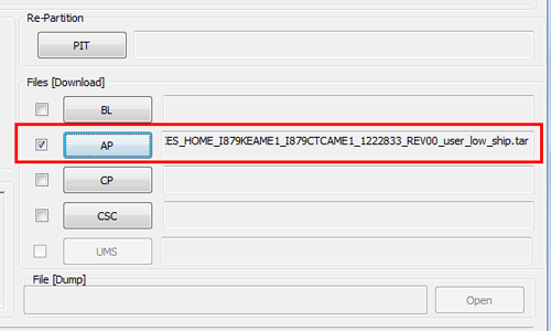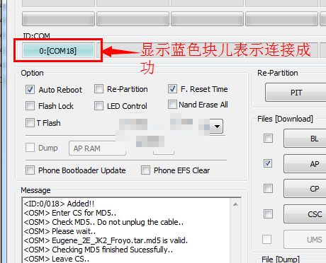 4:打開odin軟件之後軟件會自動識別你的手機,識別成功後會在ID:COM處顯示藍色的表示手機連接成功了,如果沒有顯示藍色的,說明沒有有連接好,然後勾選AP,選擇上面下載並解壓出來的tar格式的rom包。