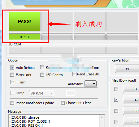 6:刷完之後,上面會顯示【PASS】字樣就表示刷入成功了。