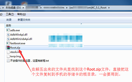 2:然後在解壓出來的文件中找到名為root的壓縮包,把這個壓縮包直接放入手機的sd卡的根目錄(就是直接把這個壓縮包直接放到sd卡中而不是某個文件夾裡面,便於待會兒查找。)