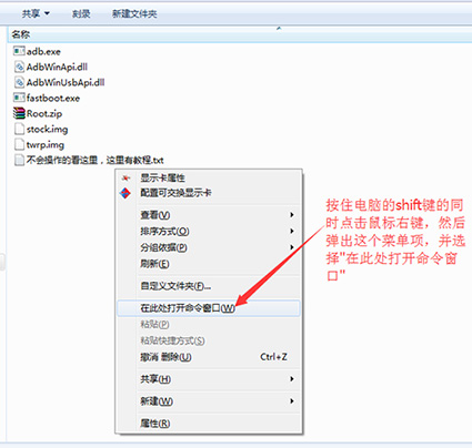 4:接下來開始刷入第三方recovery,進入你剛剛存放解壓縮文件的root文件夾,然後按住shift,點擊鼠標右鍵:在此處打開命令窗口。