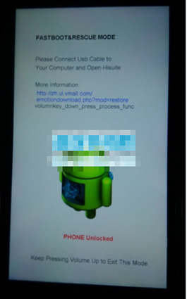 3:把你的手機關機,插上數據線連接上電腦,然後同時按電源鍵與音量減進入fastboot模式(手機必須連接電腦,否則進不去fastboot,只能進入安全模式),界面如截圖所示。左下角紅色的PHONE UNLocked 表示你的手機已經解鎖,如果是綠色的PHONE Locked 表示你未解鎖。