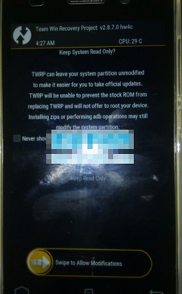 7:此時第三方rec已經刷入成功。然後拔掉數據線,電源鍵長按6秒退出fastboot模式,同時按音量加和電源鍵,出現honor標志,松開電源鍵,會進入到twrp中。(若不拔掉數據線,你會發現你始終進入的只是華為恢復eRECOVERY) ,進入recovery之後,根據提示直接滑動滑塊就行了,其它不用管。