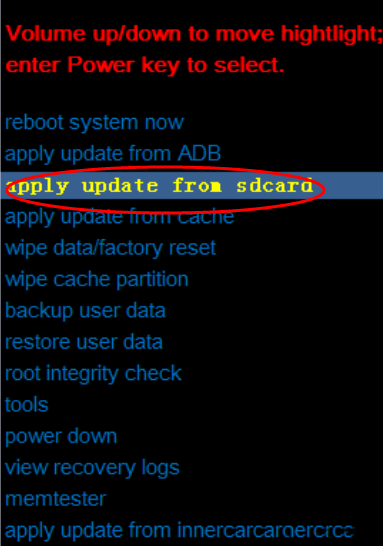 2.按音量鍵選擇“apply update from sdcard”,並按開關鍵確定。