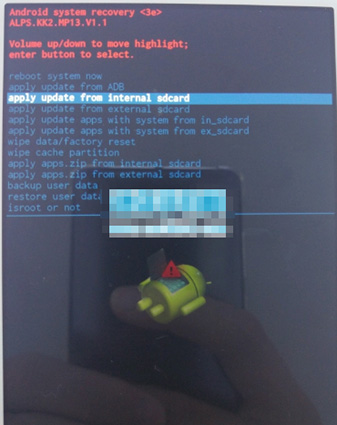 5:按音量 - 選擇apply update from internal sdcard(從內置存儲卡選擇更新)或apply update from external sdcard(從外置存儲卡選擇更新),具體根據你的rom包放位置而定,再點擊鎖屏鍵進入選擇菜單如圖所示: