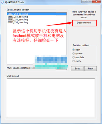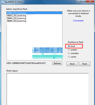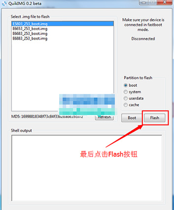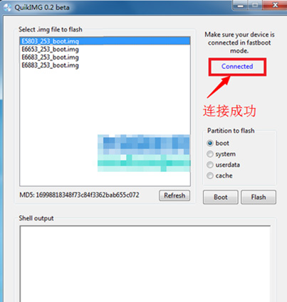 6:然後是直接雙擊打開運行【QuikIMG.exe】文件,然後選取好對應手機版本的內核包,(Z5雙卡選取E6683內核,Z5單卡選取E6653內核,Z5C單卡選取E5803內核,Z5P雙卡E6883內核),如果你的手機進入fastboot模式的話,軟件就會自動識別出手機,然後點擊flash按鈕即可始刷入了。