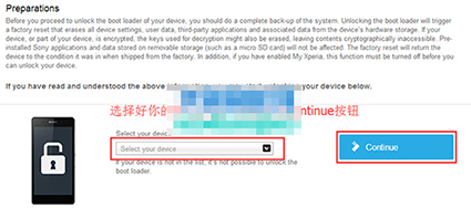 3:索尼Xperia Z5開始獲取解鎖碼,獲取解鎖碼到官方網站獲取解鎖碼,先打開這個索尼官方網站,開頭一大堆英文,是提醒你解鎖後會有各種風險,我們無視,把頁面拉到最底部,選取相應的機型,點擊“Continue”按鈕繼續。