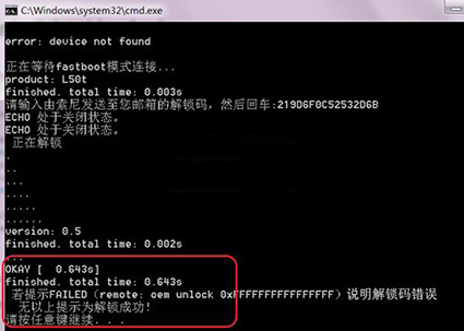 1:手機進入fastboot模式,進入的方法:手機先關機,然後按住手機的音量鍵上後,再插上連到電腦的USB數據線,成功的話,手機上角會亮起藍色LED燈(屏幕沒任何顯示)。