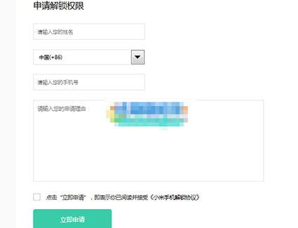 1:先進入小米官方解鎖地址,進入之後要填寫 姓名、手機號、申請理由並勾選《小米手機解鎖協議》,填寫手機接收到的驗證碼: