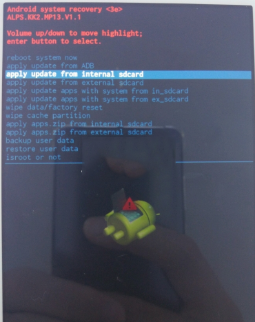 5:按音量 - 選擇apply update from internal sdcard(從內置存儲卡選擇更新)或apply update from external sdcard(從外置存儲卡選擇更新),具體根據你的rom包放位置而定,再點擊鎖屏鍵進入選擇菜單,如圖所示: