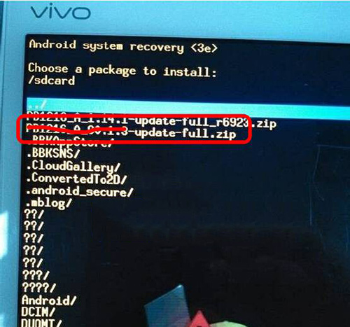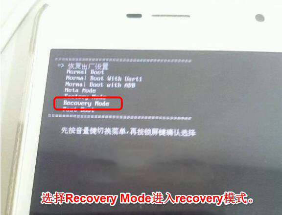 1.首先將刷機包拷貝到手機內存中。然後長按電源鍵選擇重啟,手機關機重啟期間按住音量上鍵,系統進入模式選擇處,使用音量上下鍵選擇,電源鍵確認,選擇recovery mode,如圖: