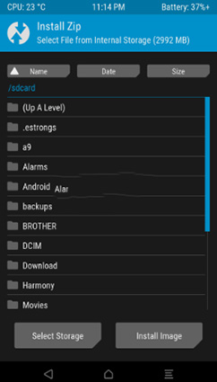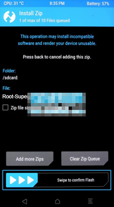 3:點擊 “Install”,即可進入系統目錄選擇文件。找到剛剛准備好的zip格式的root包,點擊它,然後滑動下方按鈕“滑動確認刷入。