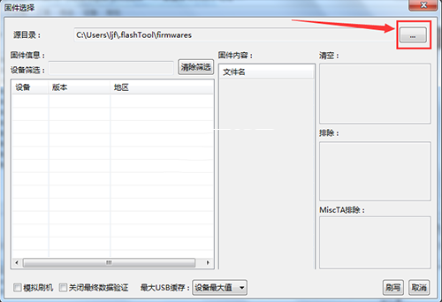 4:然後點擊【...】按鈕選擇剛才解壓出來的文件夾裡的FTF格式的文件,為了機器的干淨,請清空裡選擇所有,你也可以根據你的情況選擇,最後點擊最下面的【刷寫】按鈕即可。