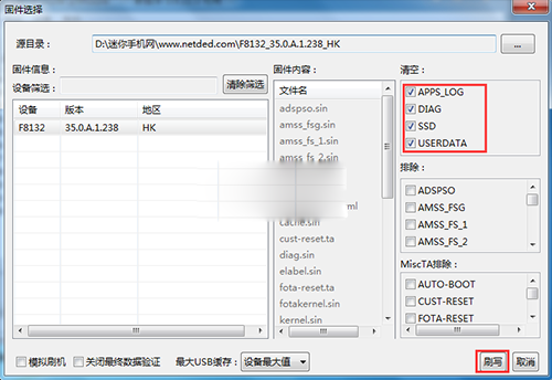 4:然後點擊【...】按鈕選擇剛才解壓出來的文件夾裡的FTF格式的文件,為了機器的干淨,請清空裡面選擇所有,你也可以根據你的情況選擇,最後點擊最下面的【刷寫】按鈕即可。