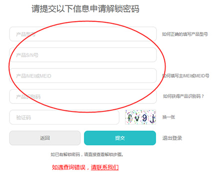 4:按照網站上的要求填寫申請資料,按照頁面提示填寫“產品類別”“產品型號”“產品S/N號”“產品IMEI/MEID”“產品識別碼”“驗證碼”然後 提交,將獲得“您的解鎖碼為:"6616********149",如長時間未收到解鎖密碼,請重新或者聯絡下面的客服。