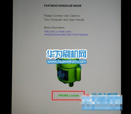 2:把手機關機,在關機狀態下同時按住【音量下鍵】+【電源鍵】不放,進入FASTBOOT白屏模式後,連接電腦,紅框裡綠色英文表示手機還沒有解鎖,如圖:
