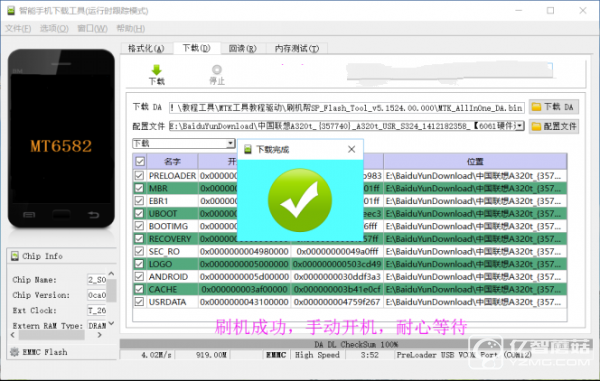 7、出現對號後,拔下數據線,重新插拔下電池,開機。首次開機需要更新系統,耐心等待3到5分鐘,中途不要動手機,以防斷電,可能會多次重啟。
