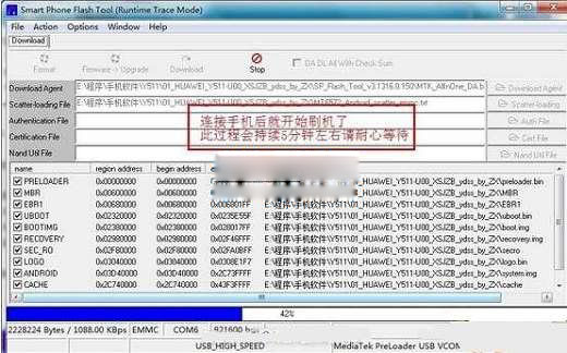 6:把手機電池拿掉再裝回去,手機不要開機,然後直接用數據線把手機與電腦連接,刷機工具會自動識別手機,開始走進度條了,如果進度條不走,請檢查您的驅動是否裝好,電腦USB接口是否正常,不行換個XP系統再做就好了。