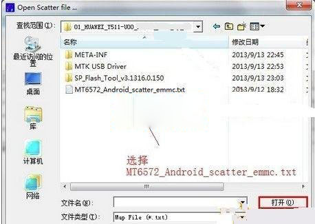 4:找到您解壓的線刷機包路徑,找到後打開文件夾並選擇“MT6572_Android_scatter_emmc.txt”並打開,如下圖: