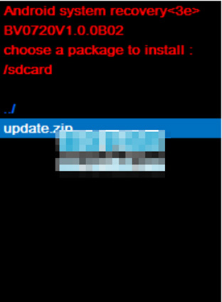 6:按音量下鍵選擇“update.zip”升級包,按電源鍵確認,手機開始升級了。