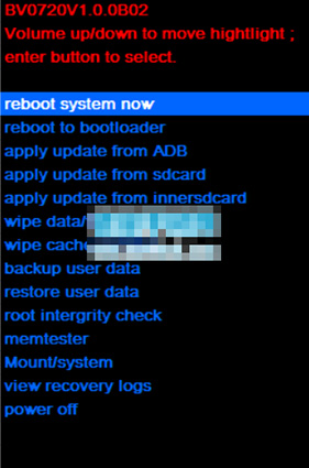4:手機在關機狀態下,同時按電源鍵,和音量上鍵,兩個組合鍵長按至屏幕點亮後即放開按鍵。約8 秒後手機會先進入recovery 界面。