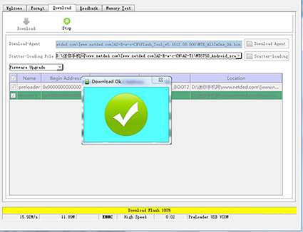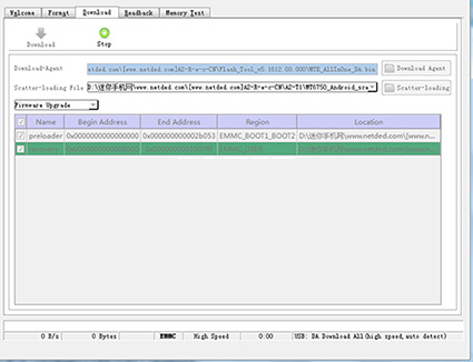 4:然後點擊軟件上的Scatter-loading按鈕選擇文件夾A2-T1裡面的MT6750_Android_scatterA22.txt,軟件會自動勾選識別到的刷機文件,確認下載方式為: Firmware Upgrade,然後點擊【Download】按鈕。